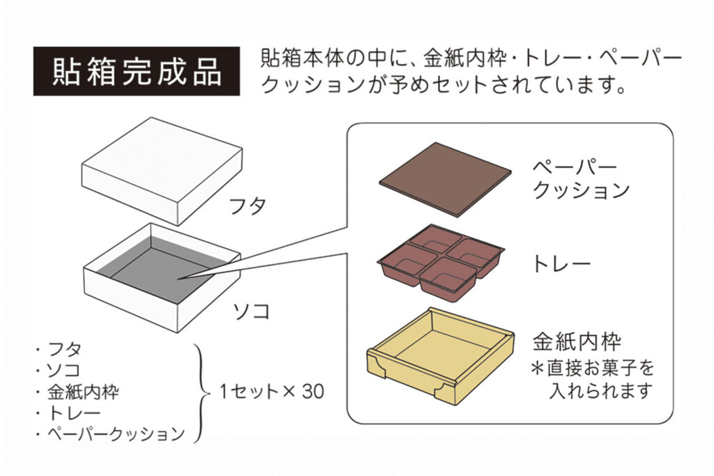 箱のフタ・ソコ以外にも金紙内枠・トレー・ペーパークッションが予めセットされているので、すぐにお使いいただけます!!!